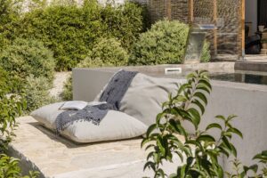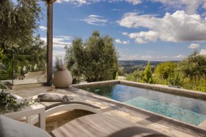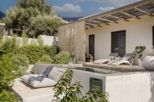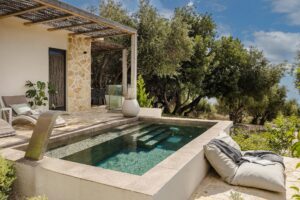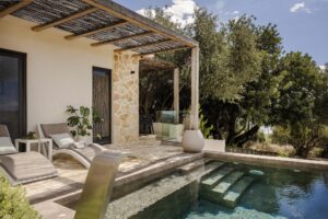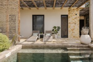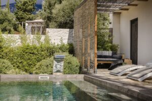 Step outside your bedroom into a serene world of soft stone textures, lush greenery and sweeping sea views stretching toward the south and west coast. The private plunge pool with a stainless-steel waterfall feature creates a soothing backdrop for mornings with coffee or sunset cocktails.