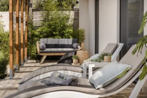 - Spacious terrace with sunbeds and outdoor dining area