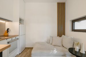 Inside, the interiors combine minimalist elegance with natural warmth – soft tones, wood elements and earthy materials bring calm and sophistication. The open-plan living space includes a fully equipped modern kitchen, a cozy lounge and floor-to-ceiling windows framing the Mediterranean landscape.